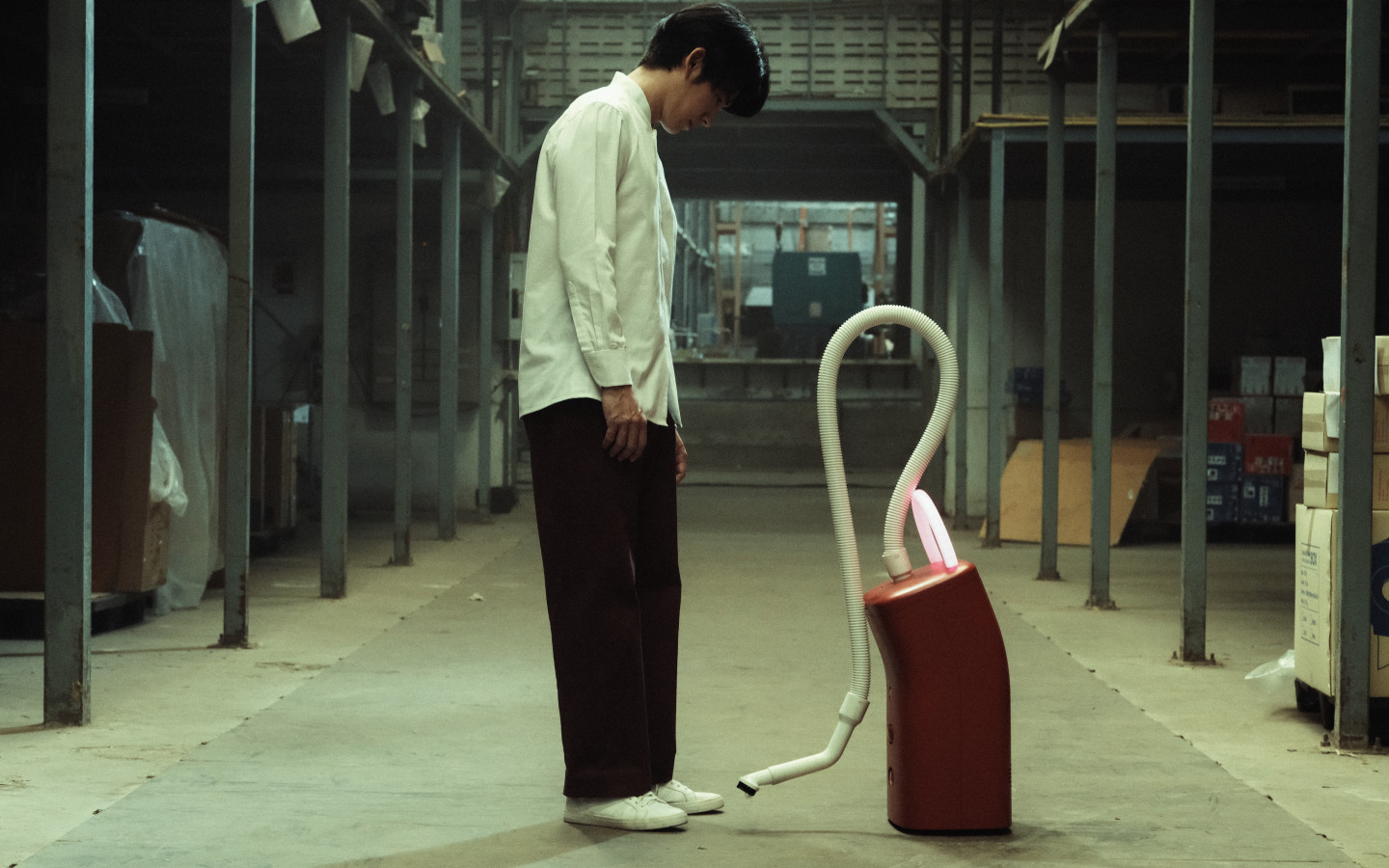 A man wakes up in the middle of the night to hear his vacuum cleaner coughing. It is the beginning of a highly original and witty cinematic experience with romantic, absurdist, and political layers. After the death of his wife, March is inconsolable until he hears a familiar voice during a visit to his mother's factory. Nat, his wife, has returned as a ghost in the form of a vacuum cleaner. But because the factory has long been plagued by vindictive poltergeists, his family does not support the unconventional love. Vacuum cleaner ghost Nat comes to the rescue and ensures that the factory can reopen. When she is asked by people higher up to also drive away ‘useless’ spirits, Nat goes along too much with the plans of the corrupt elite, putting her directly at odds with March.
